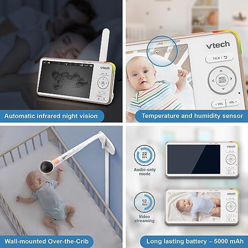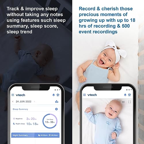 Specification: VTech V-Care 1080p FHD Over-The-Crib WiFi Smart Baby Monitor with 5″ 720p HD LCD Screen. Remote Access, Intelligence Built-in, Sleep Analysis, Rollover & Face Cover Detection, 18 hrs. Recording